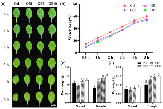 Water loss rate and fresh/dry weight of wild-type (Col) and transgenic (OEs) A. thaliana. (a) Water loss in detached leaves of A. thaliana at 0, 1, 2, 3, 4, and 5 h. Scale bar = 1 cm. (b) Water loss rate. (c) Fresh weight of A. thaliana before drought treatment and after 10 d of treatment. (d) Dry weight. All values are expressed as the mean ± SE (n ≥ 10). The different lowercase letters indicate significant differences among the four lines before stress treatment (p < 0.05), while different uppercase letters indicate significant differences among the four lines after stress treatment (p < 0.05). Error bars represent the standard error among replicates.