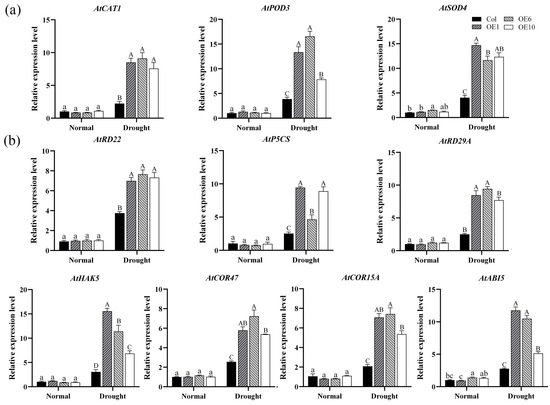 Relative expression levels of enzyme and drought-related genes in wild-type (Col) and transgenic (OEs) A. thaliana under drought stress. (a) Relative expression levels of enzyme-related genes in A. thaliana before drought treatment and after 5 d of drought stress. (b) Relative expression levels of drought-related genes. All values are expressed as the mean ± SE (n ≥ 3). The different lowercase letters indicate significant differences among the four lines before stress treatment (p < 0.05), while different uppercase letters indicate significant differences among the four lines after stress treatment (p < 0.05). Error bars represent the standard error among three replicates.
