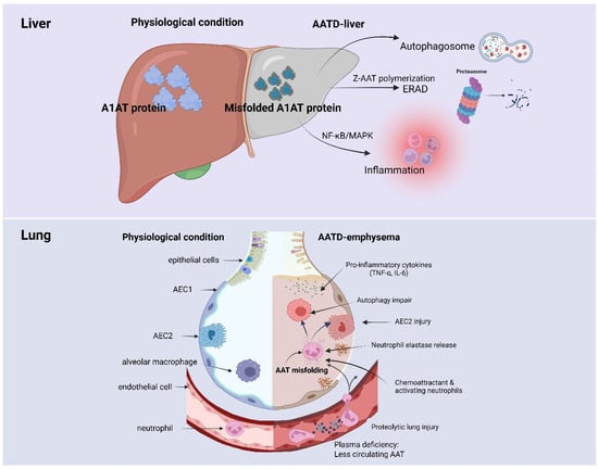 Pathophysiological mechanism of AATD-associated liver and lung injury. Under physiological conditions, the liver produces and secretes properly folded alpha-1 antitrypsin (A1AT) protein. In alpha-1 antitrypsin deficiency (AATD), especially due to the Z allele (Z-AAT), misfolded A1AT proteins accumulate in hepatocytes. These misfolded proteins can undergo polymerization and are targeted for degradation via endoplasmic reticulum-associated degradation (ERAD) and autophagy (via autophagosomes and the proteasome). However, the accumulation of misfolded A1AT may trigger activation of inflammatory signaling pathways such as NF-κB and MAPK, leading to hepatic inflammation and liver damage. On the other hand, in bottom panel (Lung): In the lungs, under normal conditions, circulating A1AT inhibits neutrophil elastase, protecting alveolar structures. In AATD-associated emphysema, the lack of functional A1AT results in reduced inhibition of neutrophil elastase. This leads to increased proteolytic lung injury. Additionally, misfolded AAT and plasma deficiency induce epithelial cell (particularly alveolar epithelial type 2 cells, AEC2) injury, impair autophagy, and promote release of pro-inflammatory cytokines such as TNF-α and IL-6. These changes further recruit and activate neutrophils, exacerbating inflammation and lung tissue destruction. Illustration was generated using BioRender.com.