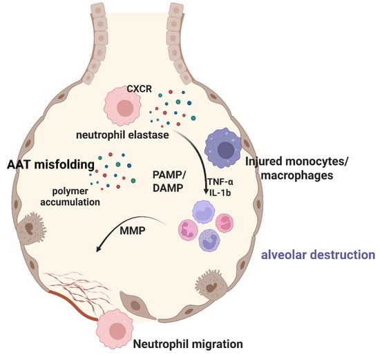 The substantial neutrophil accumulation observed in AATD lungs induces proteolytic activity and inflammatory responses. It has been demonstrated that the number of phagocytic cells denotes reduced lung function and elevated concentrations of pro-inflammatory mediators such as IL-8, IL-6, and IL-1β []. Matrix metalloproteinase-9 (MMP-9) is the main proteinase related to COPD, and among various biomarkers, MMP-9 expression is highly correlated with COPD exacerbations []. Indeed, in one study, the MMP-9 levels of individuals with COPD were found to be higher than those of healthy individuals, and MMP-9 and C-reactive protein were found to be significantly associated with declines in forced expiratory volume in 1 s (FEV1) []. The above findings indicate that AATD neutrophils are dysfunctional at the site of misfolded Z-AAT protein accumulation, associated with cellular stress and accelerated neutrophil apoptosis (Figure 2).