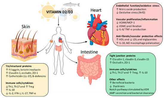 Vitamin D non-skeletal effects in skin, gut, and cardiovascular system. Schematic illustration of the pleiotropic actions of vitamin D beyond bone and mineral metabolism. In the skin, vitamin D–VDR signaling strengthens the epidermal barrier by upregulating structural proteins (filaggrin, loricrin, involucrin) and tight junction proteins (claudin-1, occludin, ZO-1), while also boosting antimicrobial peptide production (cathelicidin, β-defensins). Immune modulation includes suppression of Th1 and Th17 responses, reduced pro-inflammatory cytokines (IL-2, IFN-γ, IL-17, TNF-α), and increased Treg activity and IL-10 release. In the intestine, vitamin D enhances barrier function through increased tight junction proteins (claudin-1, claudin-3, claudin-15, occludin, ZO-1), promotes a favorable microbiota balance, stimulates the Notch pathway, and augments antimicrobial peptide secretion, thereby reducing dysbiosis and supporting mucosal immunity. In the cardiovascular system, vitamin D improves endothelial function by stimulating nitric oxide production and reducing oxidative stress via Nrf2. It limits vascular inflammation and proliferation by downregulating adhesion molecules (VCAM-1, MCP-1), vascular smooth muscle cell proliferation, and pro-inflammatory cytokines such as IL-6 and TNF-α. Additionally, vitamin D exerts anti-fibrotic and vascular-protective effects by improving lipid profiles (↑ HDL, ↓ LDL and triglycerides) and promoting anti-inflammatory macrophage polarization (IL-10, M2 phenotype). AMPs, antimicrobial peptides; HDL, high-density lipoprotein; IFN-γ, interferon-gamma; IL-2, interleukin-2; IL-6, interleukin-6; IL-10, interleukin-10; IL-17, interleukin-17; LDL, low-density lipoprotein; MCP-1, monocyte chemoattractant protein-1; NF-κB, nuclear factor kappa-light-chain-enhancer of activated B cells; NO, nitric oxide; Nrf2, nuclear factor erythroid 2–related factor 2; PMCA, plasma membrane Ca2+ ATPase; RAAS, renin–angiotensin–aldosterone system; TJs, tight junctions; TNF-α, tumor necrosis factor-alpha; TRPV5/6, transient receptor potential vanilloid 5/6; Treg, regulatory T cell; VCAM-1, vascular cell adhesion molecule-1; VDR, vitamin D receptor; VSMC, vascular smooth muscle cell; ZO-1, zonula occludens-1.