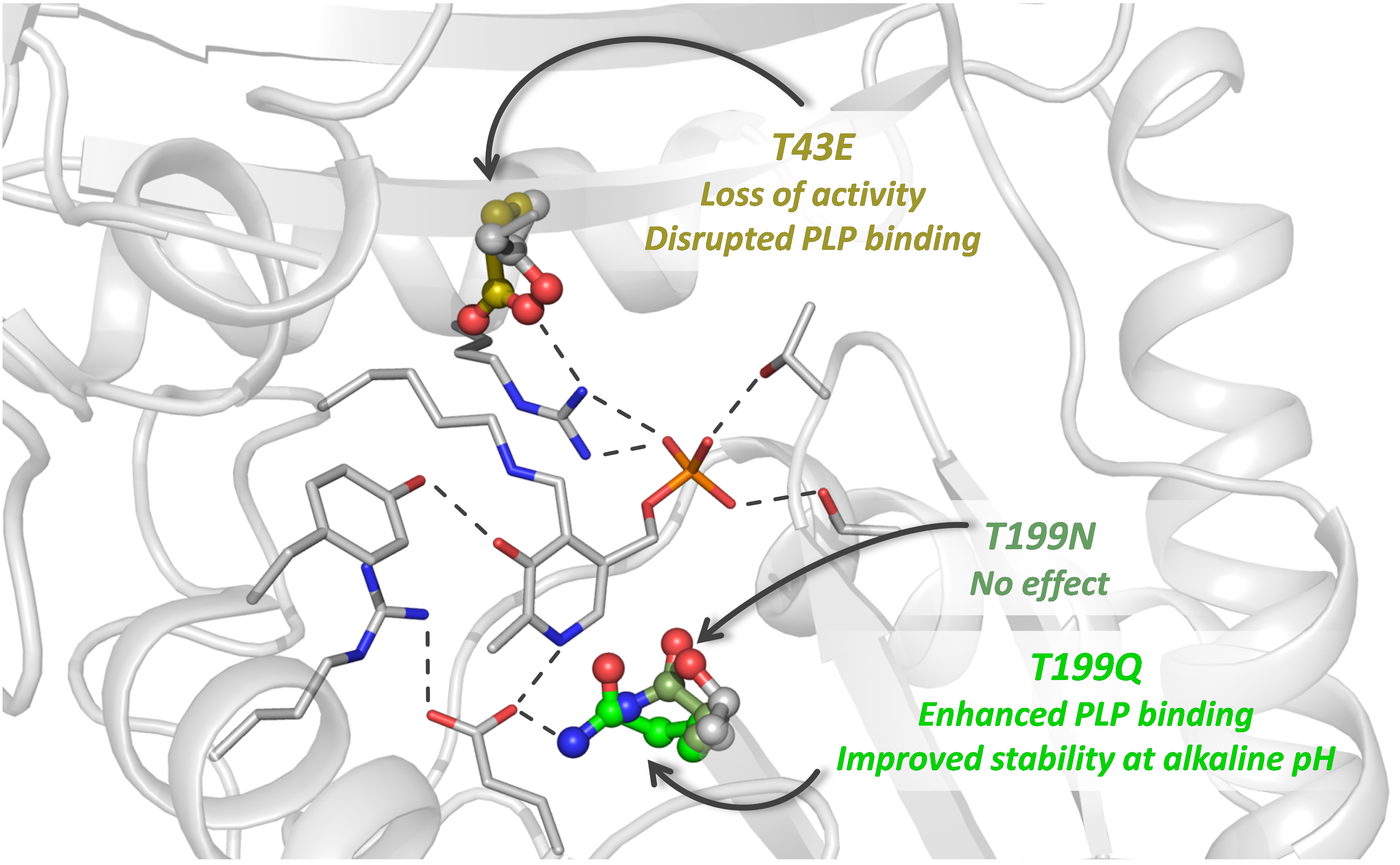 - Roura Padrosa, D.; Alaux, R.; Smith, P.; Dreveny, I.; López-Gallego, F.; Paradisi, F. Enhancing PLP-Binding Capacity of Class-III ω-Transaminase by Single Residue Substitution. Front. Bioeng. Biotechnol. 2019, 7, 282. [Google Scholar] [CrossRef]