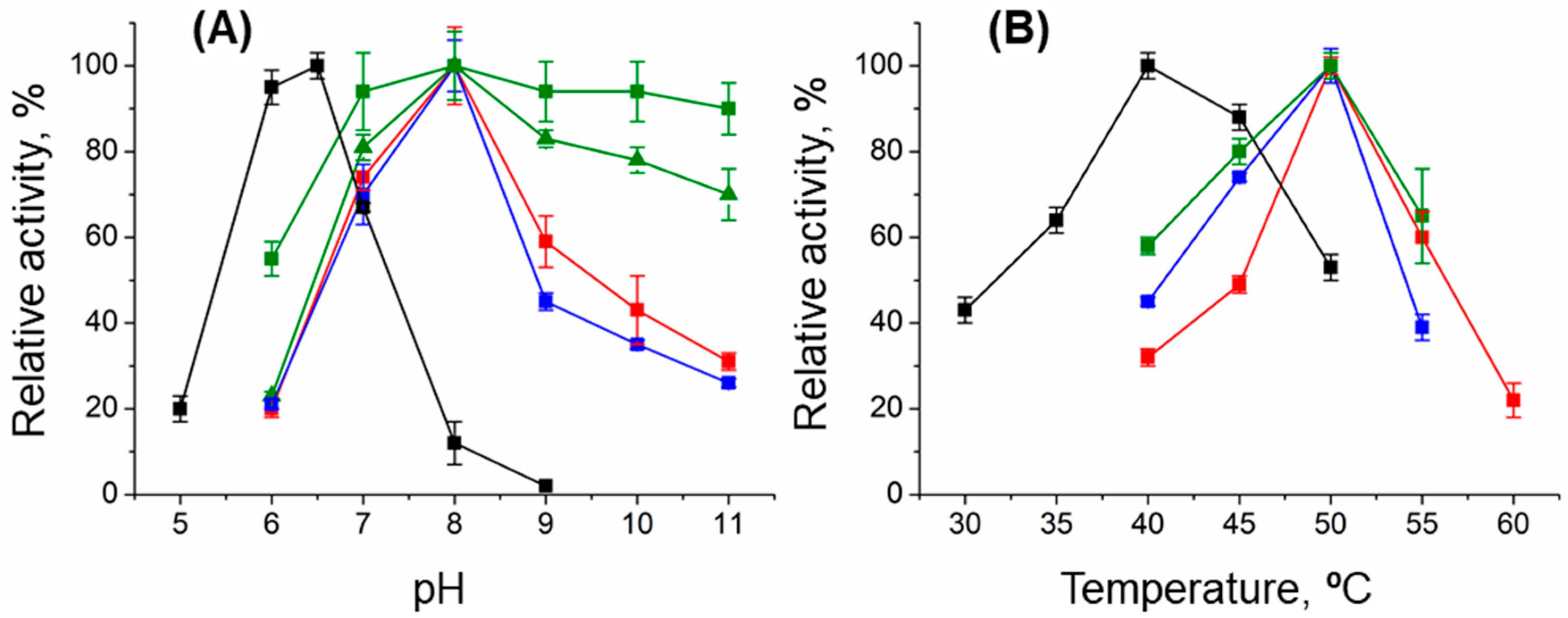 - Mikhailova, A.G.; Rakitina, T.V.; Timofeev, V.I.; Karlinsky, D.M.; Korzhenevskiy, D.A.; Agapova, Y.K.; Vlaskina, A.V.; Ovchinnikova, M.V.; Gorlenko, V.A.; Rumsh, L.D. Activity modulation of the oligopeptidase B from Serratia proteamaculans by site-directed mutagenesis of amino acid residues surrounding catalytic triad histidine. Biochimie 2017, 139, 125–136. [Google Scholar] [CrossRef]