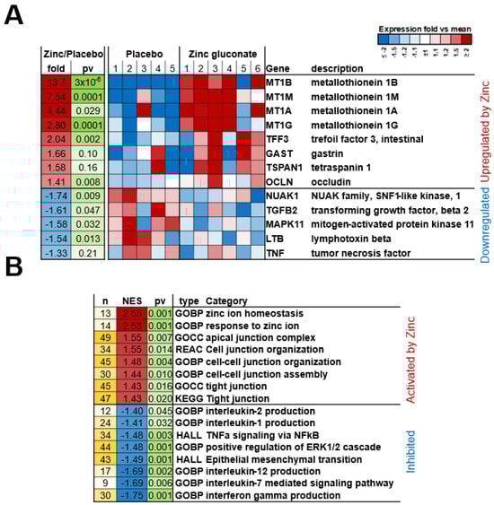 Transcriptional Changes in Duodenal–Epithelial Biopsy Tissue in Response to Zinc-Gluconate Treatment. Six patients (“zinc gluconate”) were treated with orally administered Zn gluconate (26 mg Zn BID) for 14 days prior to upper endoscopy and duodenal mucosa biopsy as described in Materials and Methods. Five patients (“placebo”) were treated with a molar equivalent amount of sodium gluconate BID. RNA was extracted from the biopsy samples and RNA–RNA-seq analyses were performed as described. Gene Set Enrichment Analysis was performed by GSEA as described [25]. (A). Expression heatmap of select individual genes related to Zn binding and TJ regulation. Fold; fold increase or decrease relative to transcription level in placebo-treated tissue; pv = DESeq2 p value; color intensity represents relative expression levels (vs placebo average) across individual patients: red—relative upregulation; blue—relative downregulation. (B). Select categories of genes enriched in response to Zn gluconate treatment as identified by Gene Set Enrichment Analysis (GSEA). These are common functional categories enriched among genes affected by Zn gluconate treatment. Among other Zn-induced patterns unrelated to epithelial barrier function (unreported here; see Supplementary Materials), a pattern of upregulations of gene transcriptions relating to epithelial junction integrity was observed in the duodenal tissue samples. A pattern of associated downregulations in modifiers of the proinflammatory state, known junctional signaling pathways such as ERK 1/2, and general modifiers of dedifferentiation, was also in evidence. Those downregulations could be consistent with improved junctional barrier function. n = number of leading-edge genes; NES = normalized enrichment score; pv = p value of the enrichment. Category types: GOBP = Gene Ontology Biological Process; GOCC = Gene Ontology Cellular Component; REAC = REACTOME pathways; KEGG = KEGG pathways; HALL = HALLMARK gene sets.