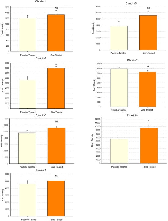 Biopsy tissue was thawed and resuspended in 4 °C lysis buffer containing sodium dodecyl sulfate with protease and phosphatase inhibitors, and then homogenized by hand using glass mortars/pestles (Wheaton, Millville, NJ, USA), thereby generating a total cell lysate. Suspensions were then sonicated, extracted for 75–90 min at 4 °C on a rotator, and ultracentrifuged. Cellular proteins were separated on Novex tris-glycine minigels. Primary antibodies to the TJ proteins, Tricellulin, and claudins -3, -4, -5 and -7 were products of Thermo Fisher (Invitrogen) (Waltham, MA, USA). Anti-Claudin-1 was a mouse monoclonal antibody (Thermo Fisher 37-4900). Anti-Claudin-3 was a rabbit polyclonal antibody (Thermo Fisher 32-9400). Anti-Claudin-5 was a mouse monoclonal antibody (Thermo Fisher 35-25-00). Anti-Claudin-7 was a rabbit polyclonal antibody (Thermo Fisher 34-9100). Anti Tricellulin was a rabbit polyclonal antibody (Thermo Fisher 48-8400). Antisera to claudin-2 was a product of Abcam (Cambridge, United Kingdom). Antisera to Protein Kinase C-α was a product of Santa Cruz Biotechnology (Dallas, TX, USA). Secondary antibodies were purchased from Southern Biotech (Birmingham, AL, USA). Quantification of Western blot results was performed by densitometry of specific protein bands using a BioRad Chemidoc MP Imaging System (Hercules, CA, USA). Densitometry conducted on Memcode stains of total protein served as loading controls for all Western blot data [73]. Densitometry was normalized (across the entire range of patients studied) by standardizing the densitometry based on the inclusion of the first placebo-treated and patient and the first zinc-treated patient in all gels/immunoblots.
