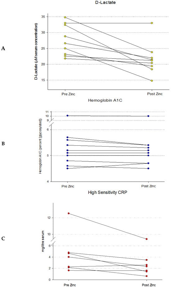 In a third, fully separate patient-based study with a unique complement of test subjects, a 7-day, 30 mg BID Zn treatment was tested for its effect on a functional indicator of the GI barrier (Figure 3). This sub-study was undertaken to determine if the Zn-induced changes to structural elements of GI barrier function in Figure 1 and Figure 2 correlated with a change in passive GI permeability (“leak”). A third independent group of healthy control, test subjects (n = 20), in this case with no active gastrointestinal disease or history of GI surgery were treated with Zn as described above. Peripheral blood samples were taken before and at the end of the Zn treatments. A placebo group was not used or needed here because of each test subject’s ability to serve as his/her own control in “before” vs. “after” measurements. Serum was collected and analyses of D-Lactate were performed as described, along with analyses of Hemoglobin A1C and High Sensitivity CRP as reference markers that would be unexpected to change with a 7-day Zn treatment. D-Lactate was chosen as a GI permeability biomarker because of its relative ease of analysis and it being a well-documented marker of passive GI permeability [26].