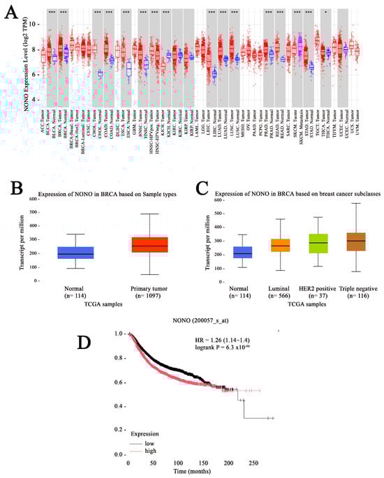 To analyze the differential expression of NONO between tumor and normal tissues, data from The Cancer Genome Atlas (TCGA) was examined using the Tumor IMmune Estimation Resource (TIMER) web tool []. The data from the TIMER database showed that the mRNA expression of NONO was significantly upregulated in the tumor tissues of various cancers, including breast cancer (Figure 1A). The analysis of TCGA data using The University of ALabama at Birmingham CANcer data analysis Portal (UALCAN) indicated elevated mRNA expression in breast cancer tissue compared to normal tissue and across all breast cancer subtypes, including Luminal, HER2 positive, and TNBC (Figure 1B,C) [,]. To determine whether the expression of NONO is associated with disease prognosis, we used a Kaplan–Meier plot (Kmplot) [], revealing that high NONO expression was correlated with worse overall survival (OS) for all breast cancer patients (Figure 1D).