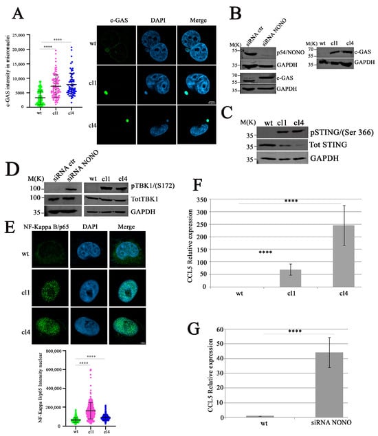 Different studies have reported the involvement of cytoplasmic DNA in the activation of the cGAS/STING pathway through cGAS localization to micronuclei and binding to micronuclear DNA []. To verify whether the presence of self-DNA in the cytoplasm, mediated by NONO silencing, triggers cGAS localization in micronuclei [], we performed confocal microscopy analysis. As illustrated in Figure 3A, shNONO clones revealed a strong enrichment of cGAS signal in micronuclei compared to controls []. Western blot analysis of cGAS protein levels confirmed its upregulation both in MDA-MB-231 siNONO and shNONO cell clones (Figure 3B), suggesting that the upregulation of cGAS protein is not a clone-dependent phenomenon. Upon DNA binding, cGAS produces, as a second messenger, a cyclic guanosine monophosphate-adenosine monophosphate (cGAMP), which activates the adaptor protein STING, leading to Tank-binding kinase-1 (TBK1) activation [,]. First, we used Western blot analysis to examine STING phosphorylation at Serine 366 (S366), which reflects its activation [], revealing its signal in NONO-depleted cells but not in control cells (Figure 3C). We consistently demonstrated increased TBK1 phosphorylation at Serine 172 (S172) [] in NONO-depleted cells (Figure 3D). Considering that TBK1 and its homolog IκB kinase epsilon (IKKε) can activate the IKK complex, thereby mediating the activation of the transcription factor nuclear factor κB (NF-κB) [], we analyzed the nuclear immunofluorescence intensity of NF-κB, showing an increased signal in shNONO clone cells (Figure 3E). Overall, our data suggest that NONO modulation induces micronuclear formation, leading to the release of DNA into the cytoplasm and activation of the cGAS/STING pathway. To further investigate whether NF-κB activation contributes to the induction of immune response genes following NONO silencing, we analyzed the expression of CC Motif Chemokine Ligand 5 (CCL5), a well-known NF-κB target gene []. Using qRT-PCR, we observed a significant upregulation of CCL5 mRNA levels in both shNONO cell clones and MDA-MB-231 siNONO-transfected cells compared to their respective controls (Figure 3F,G). These findings indicate that activation of the cGAS/STING/TBK1/NF-κB axis in the absence of NONO culminates in NF-κB-dependent transcriptional activation of pro-inflammatory genes such as CCL5, reinforcing the role of NONO in maintaining immune response.