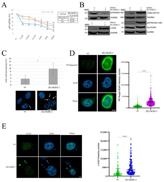 To translate these findings into potential clinical applications, we employed a NONO inhibitor, (R)-SKBG-1 [], to mimic the effects of protein expression modulation. The (R)-SKBG-1 specifically binds to cysteine 145 of the NONO protein, leading to stabilization of its complex with mRNA and inhibition of NONO protein function []. First, we assessed the effect of (R)-SKBG-1 on MDA-MB-231 wild-type (wt) and shNONO cell viability. Treatment with (R)-SKBG-1 exhibited cytotoxic effects after 72 h, with less toxicity in shNONO cell clones, as illustrated in Figure 4A, supporting the specificity of the (R)-SKBG-1 inhibitor. Additionally, we treated MDA-MB-231 wt cells with IC50 at 24 h (6.1 μM) of (R)-SKBG-1, followed by western blot analysis of the cGAS/STING pathway. As reported in Figure 4B, the NONO inhibitor induced upregulation of cGAS and phosphorylation of STING S366 and TBK1 S172 protein levels comparable to those observed in shNONO cell clones (Figure 3B). MDA-MB-231 wt cells treated with the NONO inhibitor revealed increased micronuclei formation together with upregulation of cGAS nuclear signal immunofluorescence (Figure 4C). Confocal microscopy analysis revealed that (R)-SKBG-1 treatment increased nuclear localization of p65 compared to control cells (Figure 4D). Finally, we observed an increase in cGAS signal in cytoplasmic micronuclei of MBA-MD-231 cells treated with (R)-SKBG-1 inhibitor (Figure 4E). Overall, these data demonstrate that treatment with the (R)-SKBG-1 NONO inhibitor confirms that NONO may be involved in the regulation of the immune response.