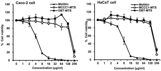 Cytotoxicity of MCCC1-MTS and DBT-MTS against Caco-2 and HaCaT cells. Cells were treated with various concentrations of melittin, MCCC1-MTS, or DBT-MTS for 24 h. Then, the cells were further incubated for 4 h in the dark after adding MTT reagent. After incubation, formed formazan crystal was dissolved. The absorbance of the solubilized formazan was measured at 530 nm to determine cell viability of each AMP.