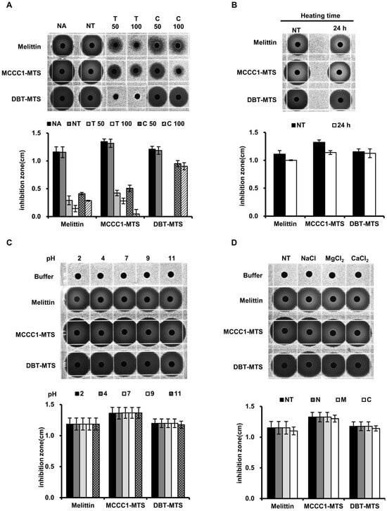 The analysis of MCCC1-MTS and DBT-MTS stability against proteases, heat, pH, and salts using RDA. (A) MTSs were treated by proteases. (B) MTSs were heated at 95 °C for 24 h. (C) MTSs were exposed to solutions of varying pH levels. (D) MTSs were dissolved in solutions containing 150 mM NaCl, 1 mM MgCl2, or 2.5 mM CaCl2. (A–D) Then, the MTSs were loaded onto each gel plate containing E. coli and were incubated for 18 h. Subsequently, the diameter of the clear inhibition zones formed on the gel plates were measured to determine antimicrobial activities of MTSs.