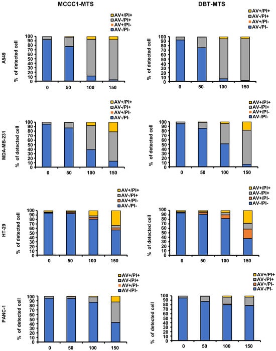 Flow cytometric analysis of MCCC1-MTS and DBT-MTS cytotoxic activity against various cancer cells. Cells were treated by various concentrations (0, 50, 100, and 150 μg/mL) of MCCC1-MTS or DBT-MTS for 24 h and stained by AV/PI.
