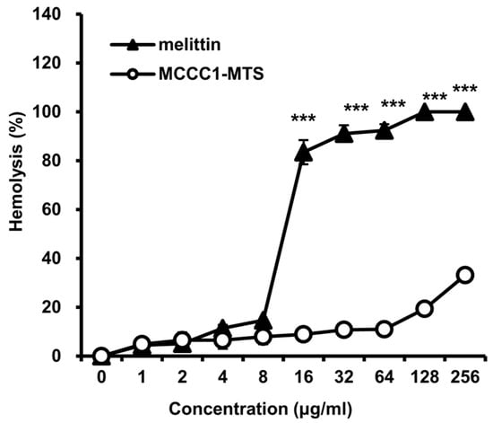 Analysis of hemolytic activities of melittin and MCCC1-MTS. Cells were treated by MCCC1-MTS or DBT-MTS for 24 h, then absorbance of RBC lysate was measured at 405 nm. Hemolysis (%) was determined by dividing the absorbance of RBC lysates treated with MCCC1-MTS or melittin by that of RBCs treated with 1% Triton X-100 and multiplying the result by 100. *** indicates p < 0.001 when compared to melittin.