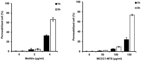 Analysis of cell permeabilization of MCCC1-MTS using trypan blue exclusion assay. Cells were treated with melittin or MCCC1-MTS for 1 or 3 h and stained using trypan blue. Then, stained cells were counted to identify permeabilized cells. Melittin was used as positive control.