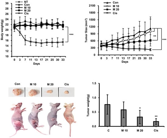 The anticancer activity of MCCC1-MTS against lung cancer was assessed using an A549 xenograft mouse model. Tumor growth was effectively suppressed in cisplatin-treated mice; however, these mice also exhibited significant body weight loss (Figure 9). In contrast, MCCC1-MTS administered at 20 mg/kg inhibited tumor growth without causing weight loss (Figure 9). Additionally, no reduction in organ weights was observed in MCCC1-MTS-treated mice (Figure 10A), and serum levels of hepatic damage markers, including aspartate aminotransferase (AST) and alanine aminotransferase (ALT), as well as renal damage markers such as blood urea nitrogen (BUN) and creatinine, remained unaltered (Figure 10B). These results demonstrate that MCCC1-MTS effectively suppresses tumor growth without inducing systemic toxicity.