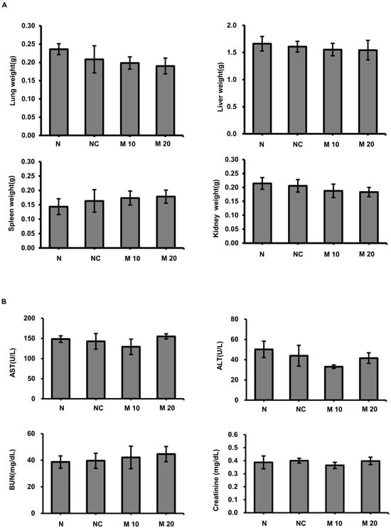 Evaluation of organ damage following MCCC1-MTS administration. (A) Weights of the lung, liver, spleen, and kidney were measured to assess potential tissue damage by MCCC-1 MTS injection. (B) Serum levels of AST, ALT, BUN, and creatinine were measured to evaluate liver and kidney function.