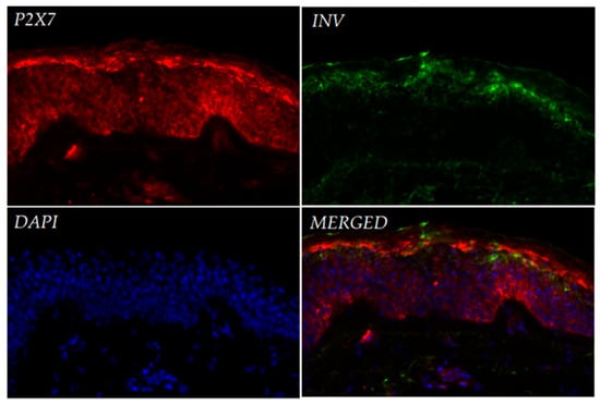 Expression of the P2X7 protein in normal human skin. Cryosections were stained with antibodies against P2X7 (red fluorescence) and involucrin (INV, green fluorescence). Nuclei were counterstained with DAPI (blue fluorescence). Merged images indicate the localization of P2X7 predominantly in the stratum granulosum and basal layers of the epidermis.