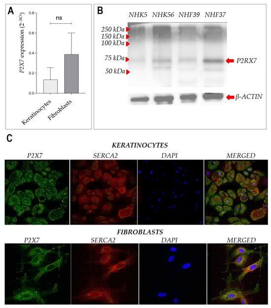 Expression of the P2X7 gene in cultured keratinocytes and fibroblasts isolated from normal human skin. (A) Relative P2X7 mRNA expression as assessed by qRT-PCR (n = 6); results are expressed as 2−ΔCt. Statistical comparison between matched keratinocyte and fibroblast samples was performed using the Wilcoxon matched-pairs signed-rank test. p < 0.05 was considered statistically significant. (B) Representative Western blot showing P2X7 and β-actin (loading control) in two keratinocyte (NHK5 and NHK56) and two fibroblast (NHF39 and NHF37) primary cell lines. (C) Immunofluorescence staining of cultured keratinocytes and fibroblasts with antibodies against P2X7 (green), SERCA2 (red), and DAPI (blue). Merged images show distinct localization patterns in both cell types.