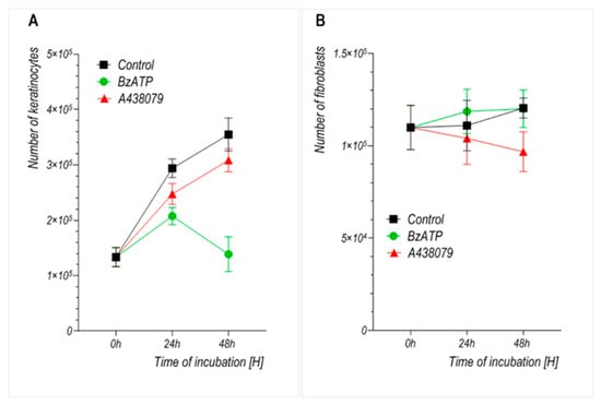 To determine the effect of P2X7 receptor stimulation on the growth of cultured keratinocytes and dermal fibroblasts, the cells were treated with the P2X7 agonist BzATP or the selective antagonist A438079. The number of cells was assessed after 24 and 48 h of incubation. As shown in Figure 3A, BzATP treatment significantly inhibited keratinocyte proliferation, resulting in a 29.4% reduction after 24 h and a 60.9% reduction after 48 h compared to untreated controls (p < 0.0001). In contrast, A438079 did not significantly affect keratinocyte proliferation. In dermal fibroblasts, neither BzATP nor A438079 exerted a significant effect on cell proliferation (Figure 3B). It should be noted that the proliferation rate of fibroblasts under basal conditions was substantially lower than that of keratinocytes.