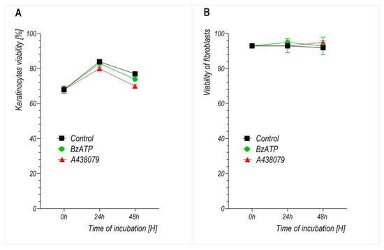 Effect of the P2X7 receptor agonist BzATP and antagonist A438079 on the viability of cultured human (A) keratinocytes and (B) dermal fibroblasts. Results represent mean ± SD from 4 independent experiments. Statistical analysis was performed using one-way ANOVA with Tukey’s post hoc test. Each time point was analyzed separately. p < 0.05 was considered significant.