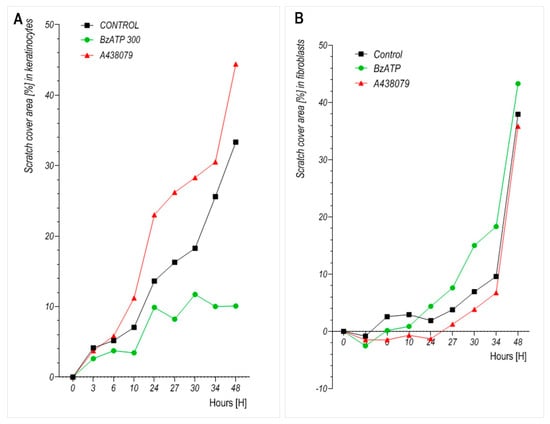 The influence of P2X7 receptor modulation on cell motility was evaluated using a cell wound healing assay. Keratinocytes and dermal fibroblasts were cultured with BzATP or A438079, and insert-defined gap closure was monitored over time. As presented in Figure 5A, BzATP markedly reduced keratinocyte migration. The closure area in the BzATP-treated group reached only ~12% after 34 h, whereas the untreated control cells reached ~30%. Conversely, treatment with A438079 enhanced keratinocyte migration compared to the controls, with the closure area exceeding 30% at the 34 h mark. In dermal fibroblasts (Figure 5B), BzATP moderately increased migration compared to control, while A438079 appeared to suppress migration, although the effects were less pronounced than in keratinocytes. Notably, fibroblasts showed delayed closure kinetics of wound area compared to keratinocytes, with migration starting to accelerate after 24 h of incubation.