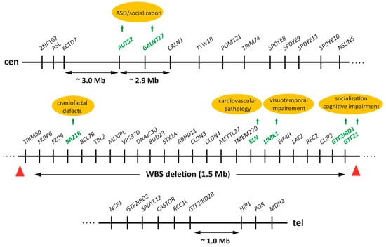 - Antonell, A.; Del Campo, M.; Magano, L.F.; Kaufmann, L.; de la Iglesia, J.M.; Gallastegui, F.; Flores, R.; Schweigmann, U.; Fauth, C.; Kotzot, D.; et al. Partial 7q11.23 Deletions Further Implicate GTF2I and GTF2IRD1 as the Main Genes Responsible for the Williams-Beuren Syndrome Neurocognitive Profile. J. Med. Genet. 2010, 47, 312–320. [Google Scholar] [CrossRef]