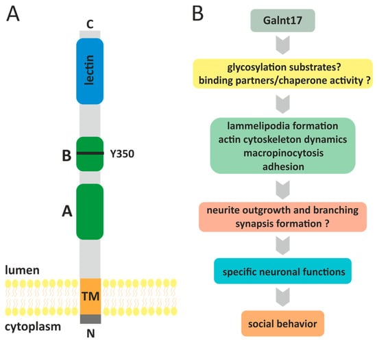 - Chen, C.-Y.; Seward, C.H.; Song, Y.; Inamdar, M.; Leddy, A.M.; Zhang, H.; Yoo, J.; Kao, W.-C.; Pawlowski, H.; Stubbs, L.J. Galnt17 Loss-of-Function Leads to Developmental Delay and Abnormal Coordination, Activity, and Social Interactions with Cerebellar Vermis Pathology. Dev. Biol. 2022, 490, 155–171. [Google Scholar] [CrossRef]