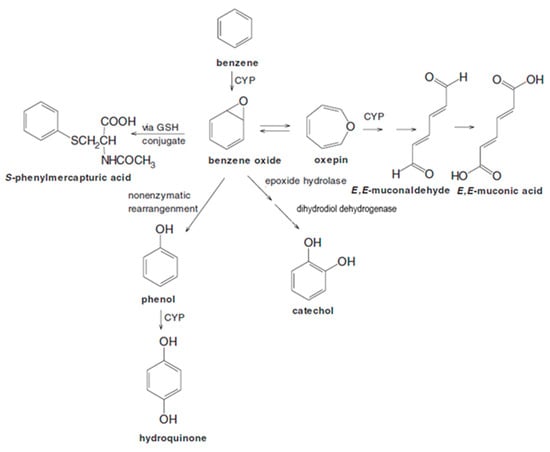 Simplified scheme of benzene metabolism showing prominent urinary metabolites. Abbreviations: CYP, cytochrome P450; GSH, glutathione. (This figure was modified from a more complex version published by the same authors [], there is no need for copyright permission).