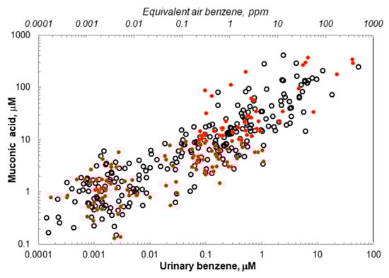 Scatter plot of 389 urinary benzene, E,E-muconic acid data pairs with open (black) and closed (red) markers representing females and males, respectively.