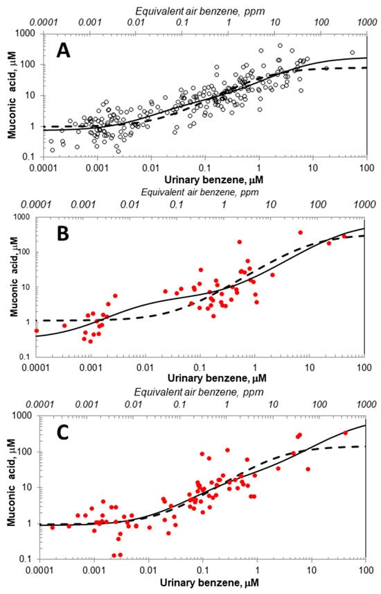 Scatter plots of urinary benzene and E,E-muconic acid data pairs for subsets of 243 female nonsmokers (A), 55 male nonsmokers (B), and 83 male smokers (C), and the corresponding fitted Michaelis–Menten-like Models 1 (dashed lines) and 2 (solid lines). (Females are represented by open black markers and males with closed red markers consistent with Figure 2).