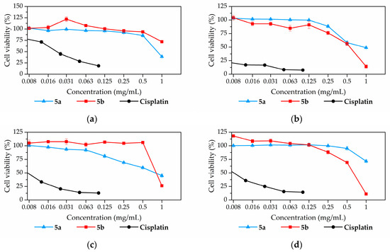 Effect of compounds 5a and 5b on the viability of various cell lines in vitro within 72 h of co-incubation: (a) BJ-5ta human foreskin fibroblasts, (b) DU 145 human prostate carcinoma, (c) MDA-MB-231 human breast carcinoma, (d) SK-Mel-28 human melanoma.