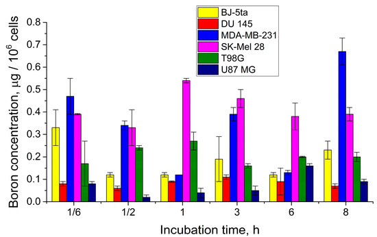 The level of boron accumulation in SK-Mel 28 melanoma cells was slightly lower (up to 0.54 µg B/106 cells after 1 h of incubation). The highest boron concentrations in cells using compound 5b exceeded the level of boron accumulation in melanoma and breast cancer cells previously achieved using boronophenylalanine (BPA) and sodium borocaptate (BSH), clinically used agents for BNCT [104,105,106]. T98G and U87 MG glioblastoma cells, DU 145 prostate carcinoma cells, and BJ-5ta foreskin fibroblasts were characterized by low levels of compound 5b accumulation.