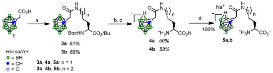 Treatment of dicarba-closo-dodecaborane derivatives, which are highly lipophilic compounds, with cesium fluoride or other fluorides is a convenient method for converting them into the corresponding dicarba-nido-undecaborane derivatives [90,91,92], which in the form of salts are often characterized by high solubility in water. We have previously used CsF treatment to prepare a number of nido-carborane derivatives, including planar-chiral ones [82,83,93]. Refluxing the protected closo-carborane derivatives 3a,b with excess CsF in ethanol followed by removal of protecting groups under acidic conditions smoothly led to the corresponding nido-derivatives 4a,b which were isolated as internal salts in moderate yields (Scheme 1). Their treatment with sodium carbonate afforded sodium salts of Nω-carboranyl amino acids 5a and 5b in a quantitative yield.