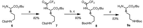 Synthesis of tert-butyl Nδ-Boc-(S)-ornithinate (9a). (a) TFAA, NEt3, CH2Cl2, −5 °C to +10 °C, 24 h; (b) H2 (8 atm), 10% Pd/C, EtOH, rt, 8 h. (c) Boc2O, NEt3, DMF, rt, 16 h. (d) 1 M NaOH, EtOH, rt, 6 h.