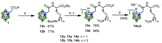 (closo-Carboran-1-yl)acetic acid (1) was used as the starting carborane-containing building block. Previously, we have shown that, starting from compound 1, carborane conjugates with natural molecules such as adenine [82], amino acids [83], and folic acid [53] can be easily synthesized. To obtain derivatives of (S)-lysine and (S)-ornithine containing one residue of nido-carborane in the side chain or at the α-amino group, we used an approach based on acylation of tert-butyl Nα-Boc or Nω-Boc amino esters followed by deboronation and removal of protecting groups in one step. We have previously demonstrated that the simultaneous removal of several protecting groups at the last stage of synthesis is convenient for obtaining carboranyl derivatives of polyfunctional amino acids [84,85], as well as lysine and ornithine derivatives with substituents in the side chain [79,86].
