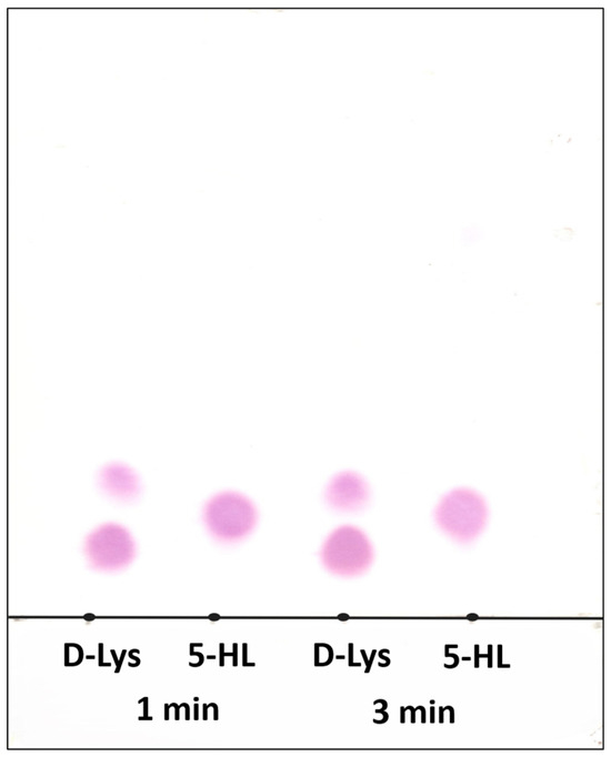 The reaction of 5-HL and 5,6-LAM does not afford the related product as revealed by the monitoring of reaction by thin layer chromatographic (TLC). TLC of the reaction mixtures was performed by quenching the reaction between 5-HL and 5,6-LAM after 1 min and 3 min. For a comparison, TLC of the reaction mixtures of 5,6-LAM and D-lysine, the natural substrate, with identical conditions was performed alongside (Figure 1). In the case of D-lysine, two distinct spots—the bottom spot corresponding to D-lysine and the top spot corresponding to the product—can be observed for both 1 min and 3 min reaction times. But only one spot corresponding to 5-HL can be observed for both timepoints. This confirms that there is no product formation in the case of 5-HL.