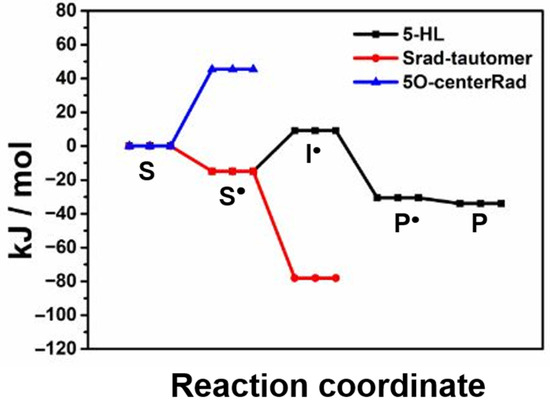 To find out the molecular structure of the 5-HL-PLP-based radical, we have performed density functional theoretical (DFT) calculations following the established methodologies for the relevant intermediates in the proposed catalytic cycle [48,49,50]. Scheme 1 displays the molecular structures of the relevant intermediates in the reaction of 5,6-LAM with 5-HL, which include S, S•, the intermediate radical (I•), the product analogue-related radical (P•), and the product analogue-PLP adduct (P). Figure 5 displays the relative energies of the pertinent intermediates obtained from DFT calculations in the reaction of 5-HL. These values are compared with the corresponding intermediates in the reaction of lysine and 4-thialysine, respectively, in Table 1. The corresponding substrate-related radical (S•Lys) could not be detected in the reaction of natural substrate lysine. DFT calculations suggested that S•Lys evades the detection by EPR because of negligible accumulation of S•Lys during the catalysis, as it is not stable enough [50]. Interestingly, the authors predicted the detection of S•TL in the reaction of 4-thialysine, as S•TL is highly stabilized by −37.7 kJ/mol (Table 1). Later, S•TL was successfully detected and characterized by EPR spectroscopy [45,46]. Nevertheless, S•TL is transient and tautomerizes into Srad-tautomerTL, which is further stabilized by 26.4 kJ/mol than S•TL [45]. A similar energy profile (Table 1) of 5-HL as compared to that of lysine indicates that it should afford the product in the gas phase, as it is comparable with that of lysine. On the basis of similar relative energies of S• and S•Lys, like in the case of S•Lys, the detection of S• by EPR is not possible. In contrast to lysine, the catalytic cycle is broken at one stage in the case of 5-HL either by over-stabilization of the intermediate in one of the steps of the native catalytic cycle or due to the transformation to other feasible unproductive pathways. Hence, we have also calculated the relative energies of two other putative radical intermediates which may be generated due to transformations not pertaining to the catalytic cycle: first, an alkoxyl radical (5-OcenterRad, Scheme 1) generated from the abstraction of the hydrogen atom from the 5-OH group of 5-HL; second, a tautomerized radical (Srad-tautomer, Scheme 1) from S• similar to Srad-tautomerTL that was observed in the case of 4-thialysine [16,45].