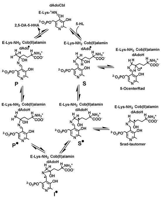 - Menon, B.R.K.; Fisher, K.; Rigby, S.E.J.; Scrutton, N.S.; Leys, D. A Conformational Sampling Model for Radical Catalysis in Pyridoxal Phosphate- and Cobalamin-dependent Enzymes. J. Biol. Chem. 2014, 289, 34161–34174. [Google Scholar] [CrossRef][Green Version]
