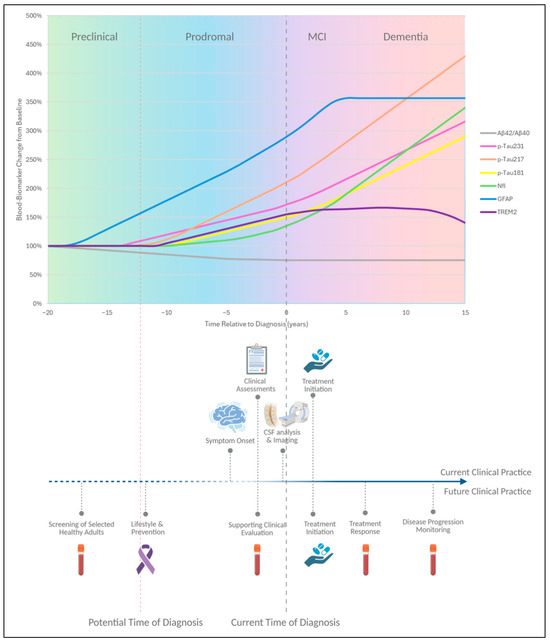 Temporal trajectories of blood biomarkers across the Alzheimer’s disease continuum, from the preclinical phase to dementia. Early changes precede symptom onset by many years, while subsequent increases reflect progression of pathology, neurodegeneration, and glial activation. The lower panel contrasts current reliance on CSF and imaging with future perspectives where blood biomarkers will support early detection, stratification, therapeutic monitoring and longitudinal follow-up. This figure was created with Biorender.com.
