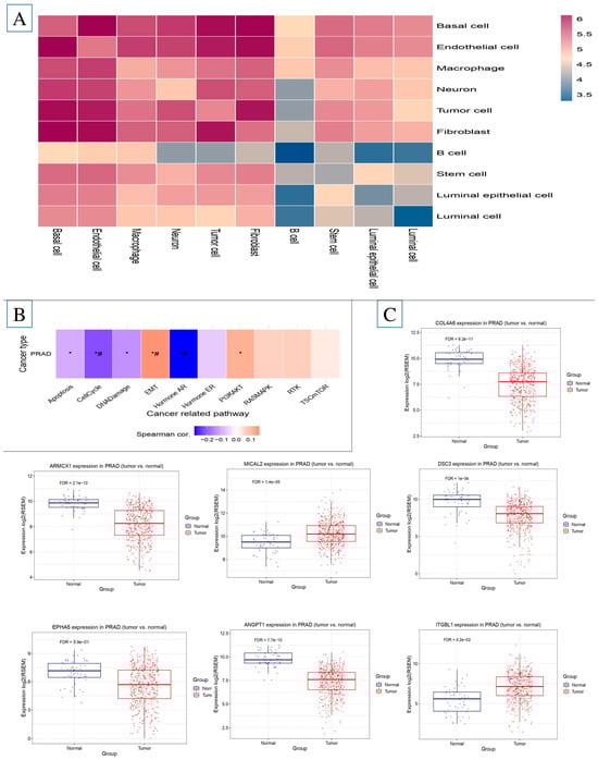 Figure 2. Correlation between cell–cell gene expression and gene expression analysis. (A) Correlation between cell–cell gene expression in prostate cancer; (B) collect gene involved in EMT gene in PCa; (C) identify EMT genes present in the microenvironment of prostate cancer and determine the levels of mRNA expression for the genes ARMCX1, BEX4, TMEM43, VASH1, C1QTNF1, COL10A1, and COL4A6 in tissue samples of prostate cancer using the GSE database. * means p-value < 0.05, and # means p-value < 0.001.