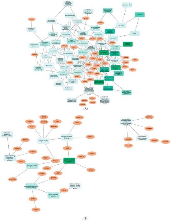 Cytoscape (version 3.10.3) network analysis was utilized to discover the master genes. Figure 1B displays the found genes using the yFiles radial layout. The network detected the DEGs by examining their connections. The 45 genes that are highly interconnected also have the strongest and most dependable interactions, as seen in the diagram. ARMCX1, BEX4, TMEM43, VASH1, C1QTNF1, COL10A1, and COL4A6 are all important gene regulators, each of which regulates one of these genes in a unique manner. Multiple Cytoscape network configurations found significant gene connections. To ensure that the yFiles radial design was right, the network analysis tool Cytoscape was used. Figure 2A–C show that the Centiscape plugin found the most significant 33 co-expression genes as follows: ANGPT1, ANGPT4, ARMCX1, BEX4, C1QTNF1, COL10A1, COL4A6, COL8A1, CRTAP, CXorf51B, DSG1, DSG3, EFNA1, EFNA2, EFNA3, EFNA4, EFNB2, EPHA5, ITGA10, ITGA11, ITGA3, ITGA5, ITGB5, ITGBL1, MICAL2, MID2, NGEF, OTOL1, PKP1, PRR32, SAMD5, SPRR1A, SPRR1. The PPI network graph was visually examined using Cytoscape and data from the STRING database. The CytoHubba plugin effectively identified genes that were up- or down-regulated. As a result, inside the gene regulatory network, we discovered a cluster of fifty unique genes. As illustrated in Figure 2A,B, nine hub target genes were discovered to be shared: ITGA10, ITGA11, ITGA3, ITGA5, ITGB5, ITGBL1, MICAL2, MID2, and NGEF.