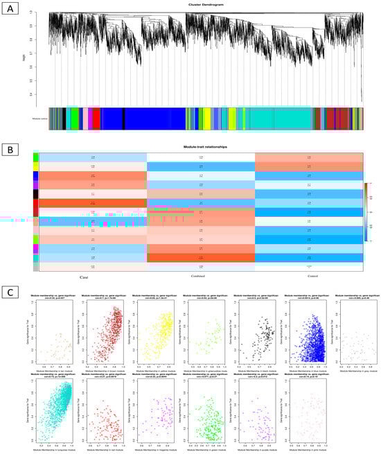 55. Pei, G.; Chen, L.; Zhang, W. WGCNA application to proteomic and metabolomic data analysis. In Methods in Enzymology; Elsevier: Amsterdam, The Netherlands, 2017; Volume 585, pp. 135–158. [Google Scholar]