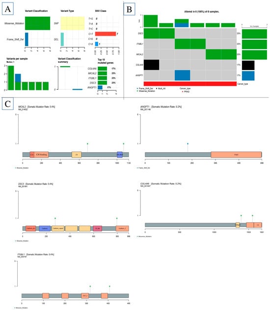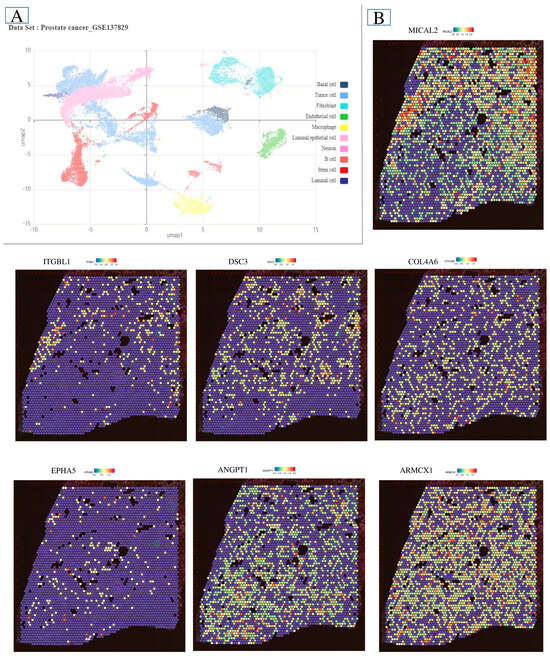 Differential gene expression was detected in both prostatic and normal cell populations. Analysis of transcripts with PANTHER indicated that the differentially expressed RNAs include a diverse array of gene sequences spread throughout the EMT. The genes ITGBL1, DSC3, COL4A6, ANGPT1, ARMCX1, MICAL2, and EPHA5 have been recognized as pivotal genes that substantially affect the microenvironment of prostate cancer (Figure 1B).