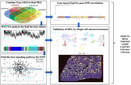 Figure 9. Flowchart illustrating the integrative bioinformatics pipeline used to identify and validate EMT-related genes in prostate cancer. The workflow includes DEG screening, PPI network construction, functional enrichment analysis, WGCNA, single-cell expression profiling, and clinical validation through survival and eQTL analyses.