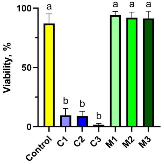 Cytotoxicity assessment of peripheral blood lymphocytes using trypan blue to quantify cell viability after exposure to chitosan–alginate gel and nanoencapsulated curcumin in the chitosan–alginate carrier: control—control group; C1—group receiving chitosan–alginate gel with nanocurcumin at a dose of 10 mg; C2—group receiving chitosan–alginate gel with nanocurcumin at a dose of 5 mg; C3—group receiving chitosan–alginate gel with nanocurcumin at a dose of 2.5 mg; M1—group receiving chitosan–alginate gel at a dose of 500 g; M2—group receiving chitosan–alginate gel at a dose of 250 g; M3—group receiving chitosan–alginate gel at a dose of 125 g. Data are expressed as the mean and standard error of the mean (SE) (n = 5 in each group). Values marked with different letters are significantly different at p < 0.05.