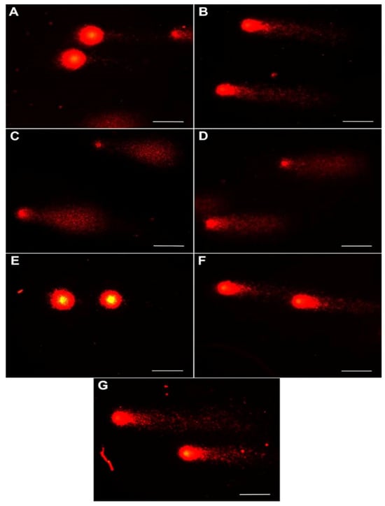Representative images of peripheral blood cells exposed to chitosan–alginate gel and nanoencapsulated curcumin in a chitosan–alginate carrier in the comet assay: (A) cells from control; (B) cells exposed on chitosan–alginate gel with nanocurcumin at a dose of 10 mg; (C) cells exposed on chitosan–alginate gel with nanocurcumin at a dose of 5 mg; (D) cells exposed on chitosan–alginate gel with nanocurcumin at a dose of 2.5 mg; (E) cells exposed on chitosan–alginate gel at a dose of 500 g; (F) cells exposed on chitosan–alginate gel at a dose of 250 g; and (G) cells exposed on chitosan–alginate gel at a dose of 125 g. All scale bars show 50 µm.