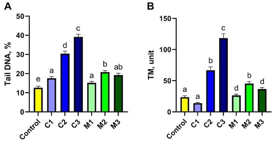 Genotoxicity assessment of peripheral blood lymphocytes using the comet assay for tail DNA (A) and TM (B) parameters after exposure to chitosan–alginate gel and nanoencapsulated curcumin in a chitosan–alginate carrier: control—control group; C1—group receiving chitosan–alginate gel with nanocurcumin at a dose of 10 mg; C2—group receiving chitosan–alginate gel with nanocurcumin at a dose of 5 mg; C3—group receiving chitosan–alginate gel with nanocurcumin at a dose of 2.5 mg; M1—group receiving chitosan–alginate gel at a dose of 500 g; M2—group receiving chitosan–alginate gel at a dose of 250 g; M3—group receiving chitosan–alginate gel at a dose of 125 g. Data are expressed as the mean and standard error of the mean (SE) (n = 5 in each group). Values marked with different letters are significantly different at p < 0.05.