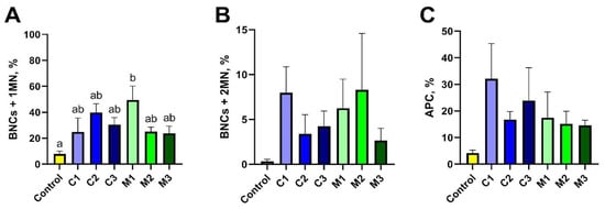 Evaluation of toxicity assessed in the micronucleus test based on BNCs + 1MN (A), BNCs + 2MN (B), and APC (C) parameter values after exposure to chitosan–alginate gel and nanoencapsulated curcumin in a chitosan–alginate carrier: control—control group; C1—group receiving chitosan–alginate gel with nanocurcumin at a dose of 10 mg; C2—group receiving chitosan–alginate gel with nanocurcumin at a dose of 5 mg; C3—group receiving chitosan–alginate gel with nanocurcumin at a dose of 2.5 mg; M1—group receiving chitosan–alginate gel at a dose of 500 g; M2—group receiving chitosan–alginate gel at a dose of 250 g; M3—group receiving chitosan–alginate gel at a dose of 125 g. Data are expressed as the mean and standard error of the mean (SE) (n = 5 in each group). Values marked with different letters are significantly different at p < 0.05.