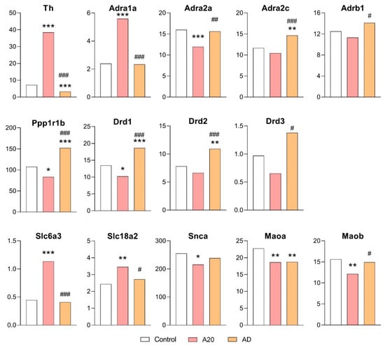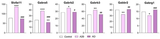 - Babenko, V.N.; Smagin, D.A.; Kovalenko, I.L.; Galyamina, A.G.; Kudryavtseva, N.N. Differentially expressed genes of the Slc6a family as markers of altered brain neurotransmitter system function in pathological states in mice. Neurosci. Behav. Physiol. 2020, 50, 199–209. [Google Scholar] [CrossRef]