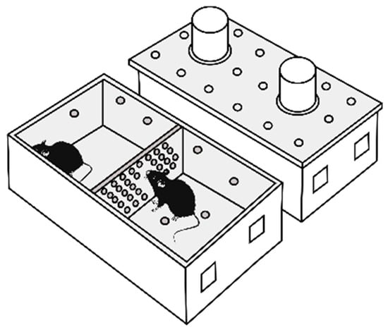 - Kudryavtseva, N.N. Use of the “partition” test in behavioral and pharmacological experiments. Neurosci. Behav. Physiol. 2003, 33, 461–471. [Google Scholar] [CrossRef]